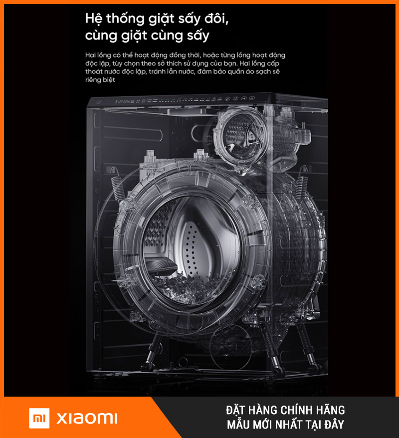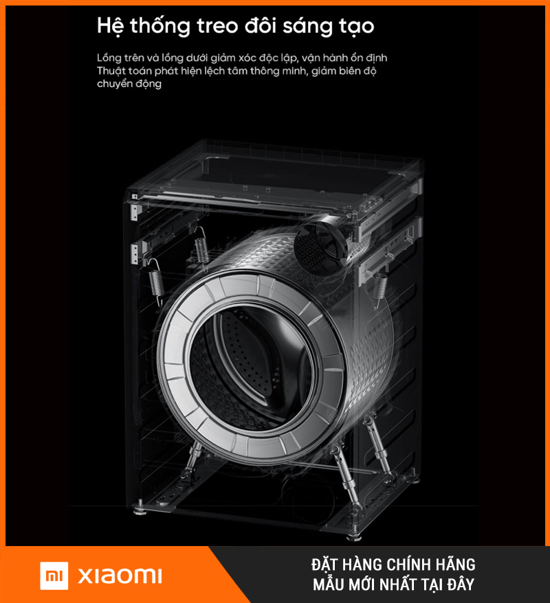 Máy giặt sấy Xiaomi Mijia MJ107 được trang bị hệ thống treo đôi độc lập cho từng lồng giặt, giúp máy vận hành ổn định ngay cả khi hai lồng hoạt động đồng thời.