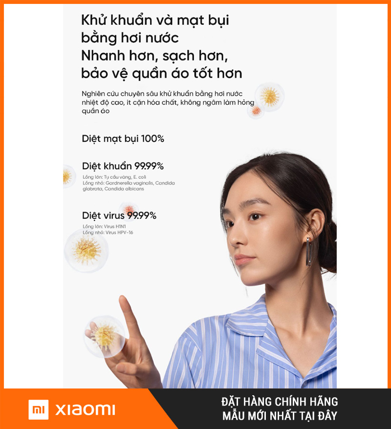 Máy giặt sấy Xiaomi Mijia MJ107 được trang bị công nghệ khử khuẩn và loại bỏ mạt bụi bằng hơi nước nhiệt độ cao, giúp hơi nước thẩm thấu sâu vào từng sợi vải.