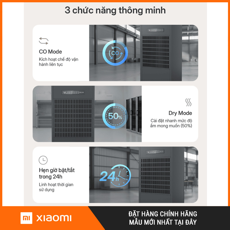 | Chế độ hoạt động | ① CO – Chạy liên tục ② Dry – Tự động duy trì độ ẩm 50% ③ Hẹn giờ bật/tắt 24 giờ |