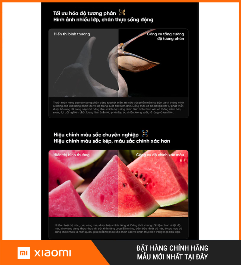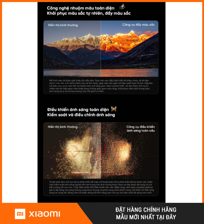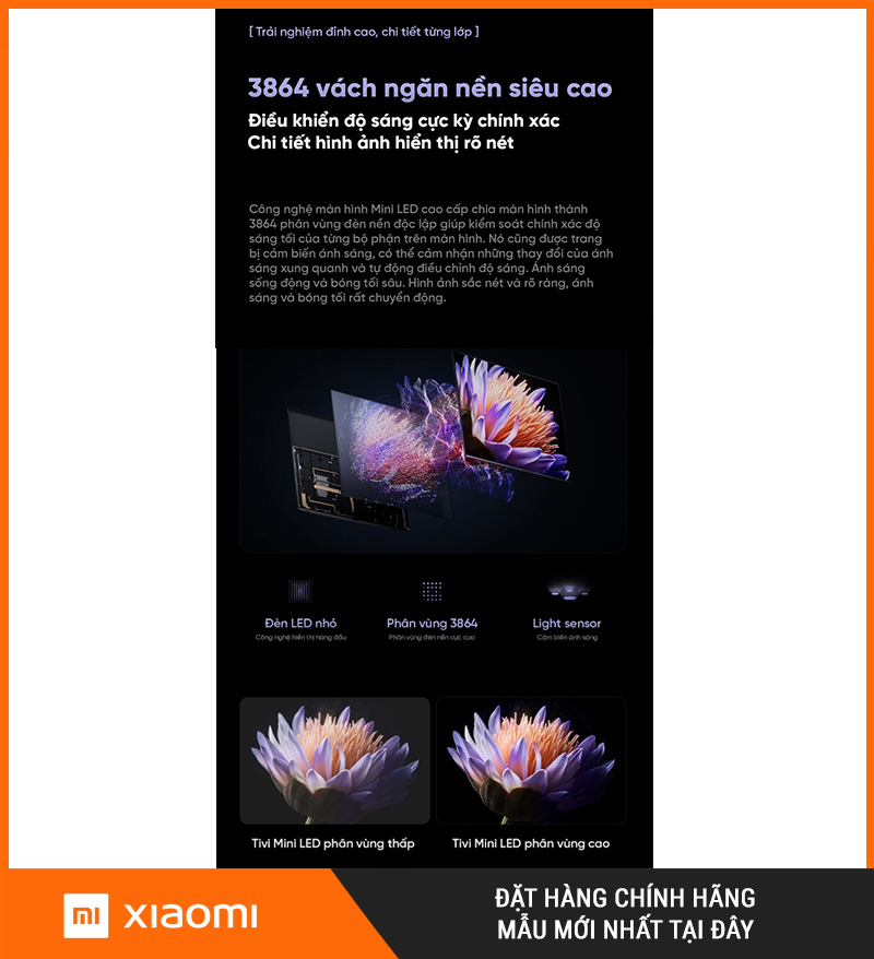 Tivi Xiaomi S Pro 100 inch 2025 được trang bị công nghệ Mini LED thế hệ mới, mang đến chất lượng hình ảnh vượt trội so với các dòng tivi truyền thống. Với hơn 2000 vùng làm mờ cục bộ (local dimming zones), màn hình có khả năng điều chỉnh độ sáng tối theo từng khu vực, giúp tái tạo hình ảnh chính xác đến từng chi tiết nhỏ nhất.