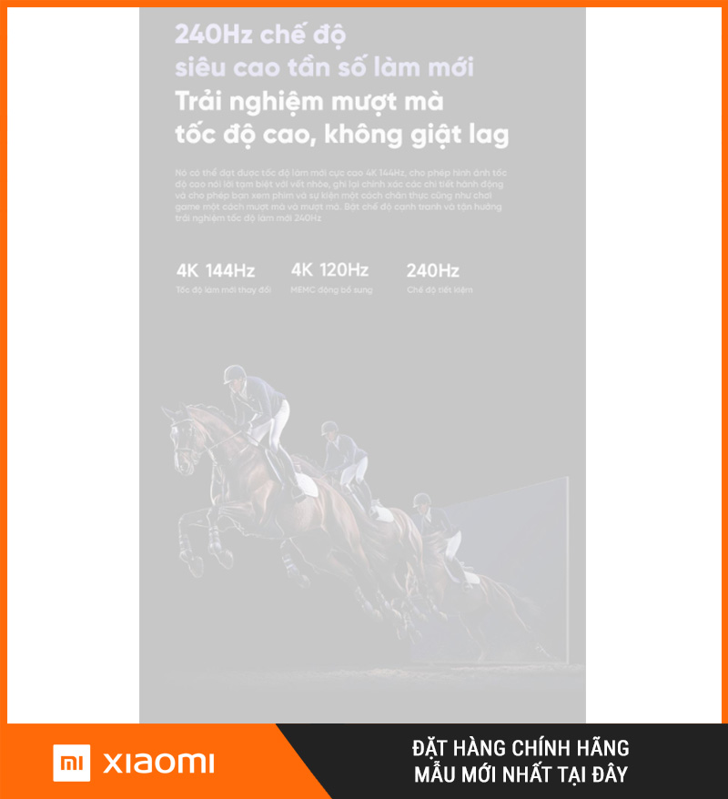 Tần số quét mặc định 144Hz đã đủ mượt, nhưng Xiaomi nâng cấp lên 240Hz trong chế độ cạnh tranh, đặc biệt hữu ích với game thủ và nội dung tốc độ cao.
