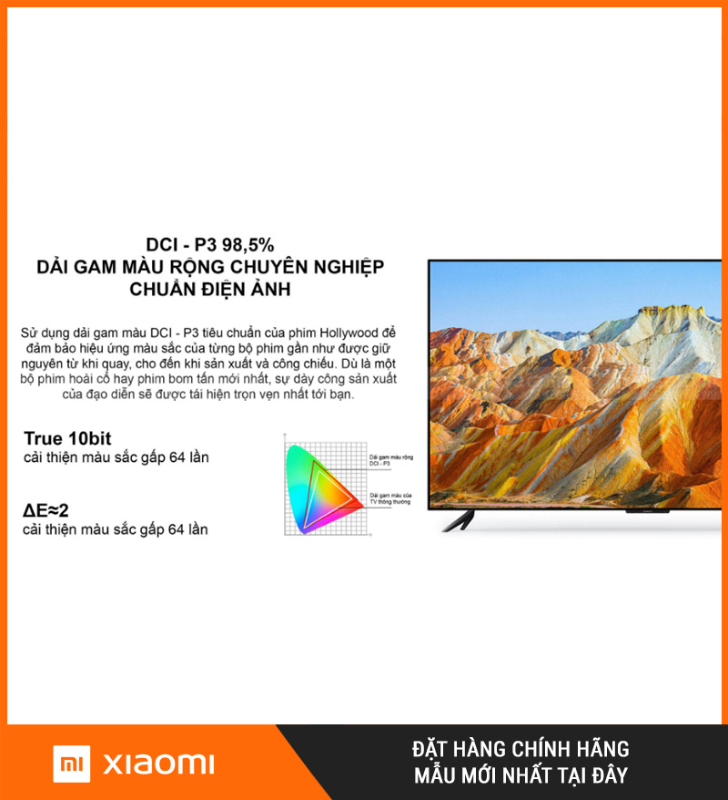 TV6 đạt 98.5% DCI-P3 – đây là dải màu thường dùng trong chuẩn điện ảnh, giúp màu sắc hiển thị rộng hơn, giàu sắc độ hơn (đặc biệt ở các tông khó).